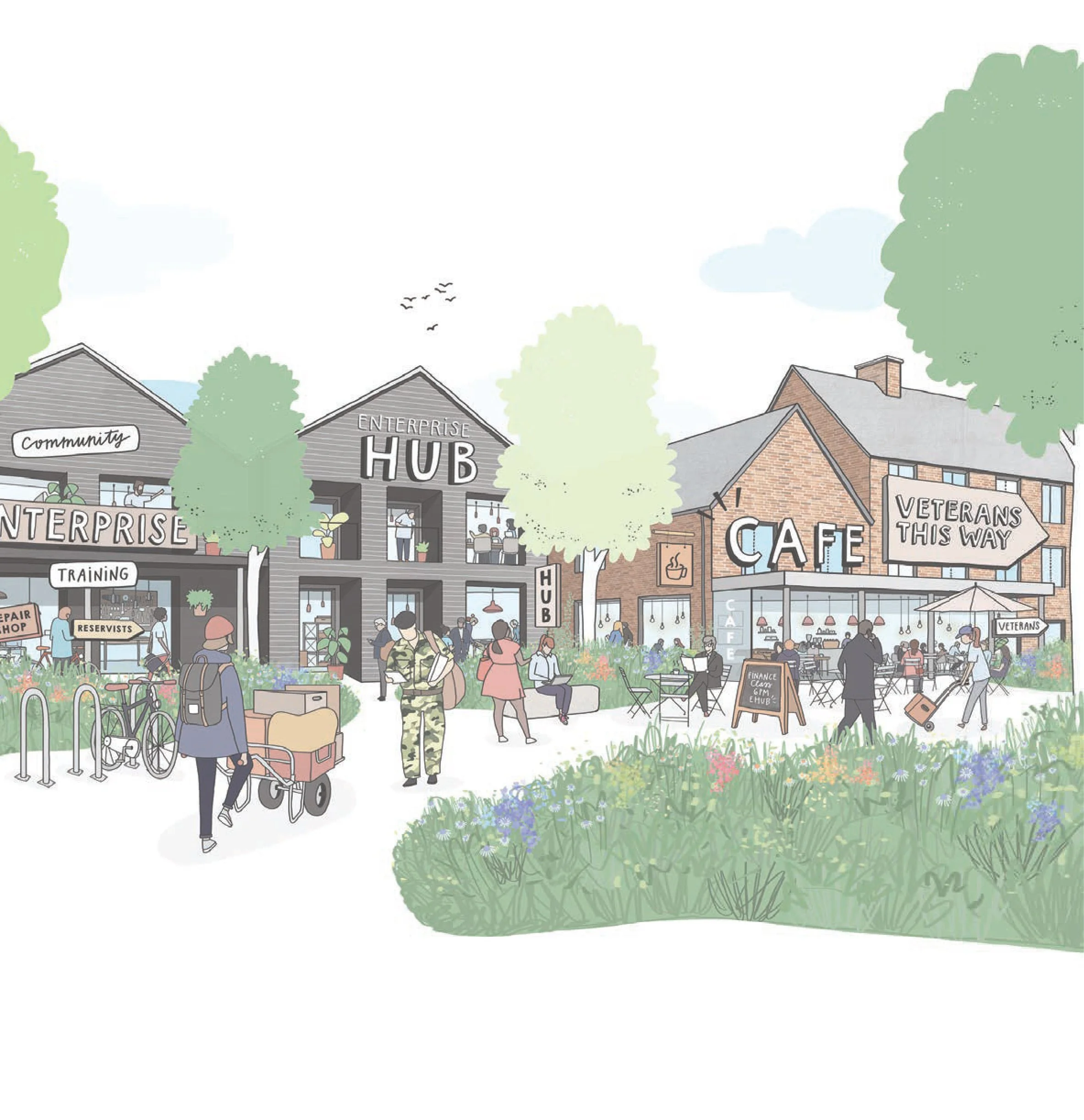 A café and enterprise space on the ground floor of one of the apartment blocks, which would be operated by veterans and open to the whole community.